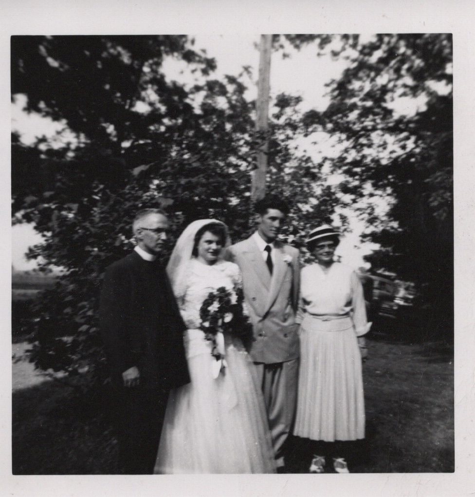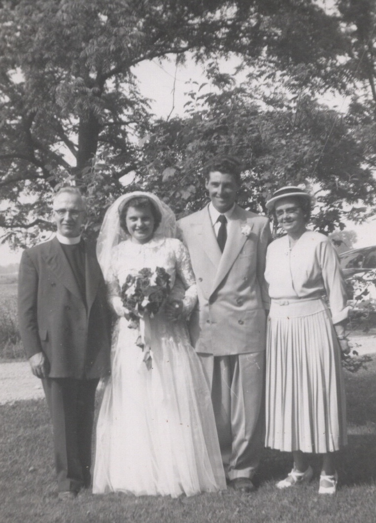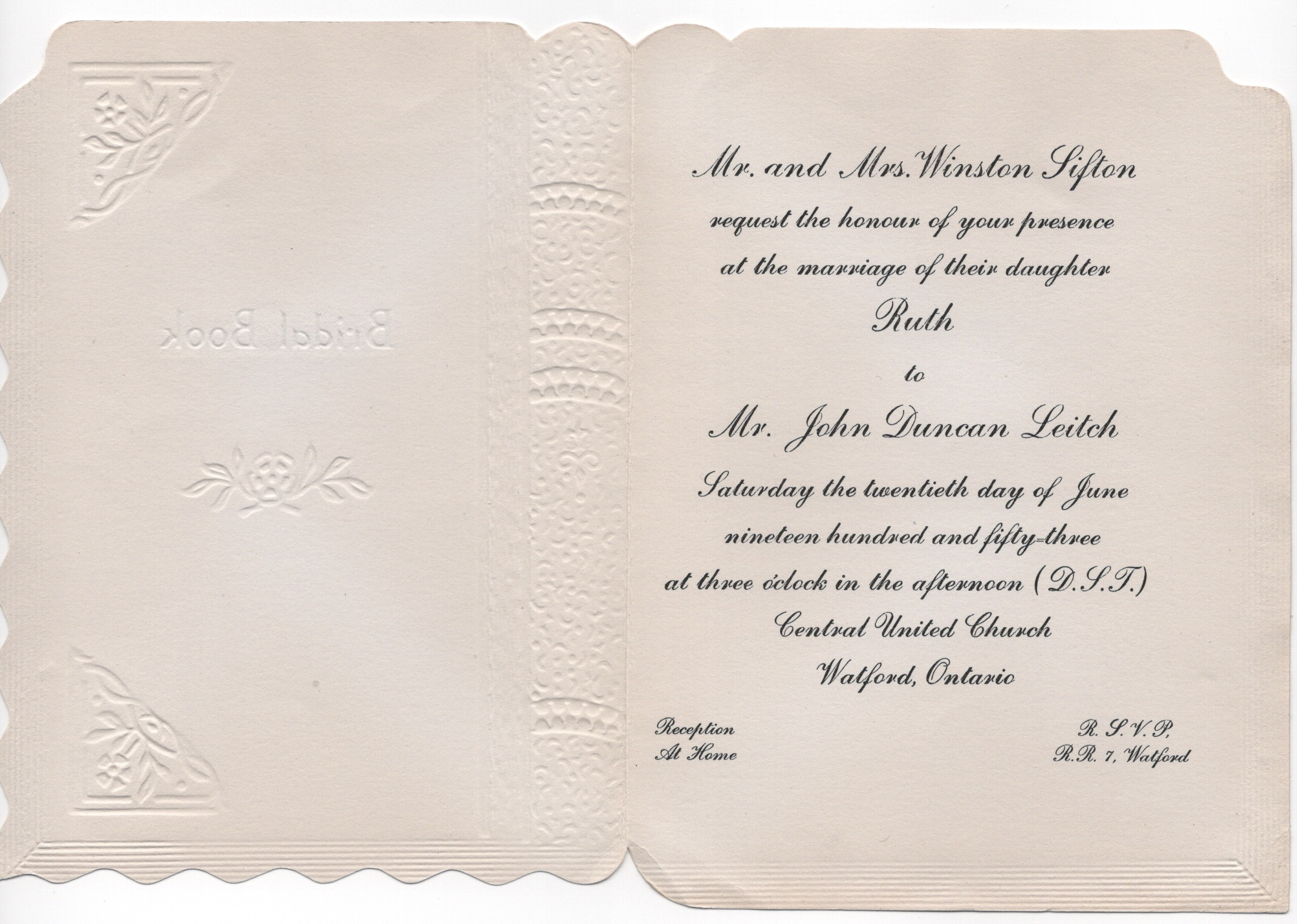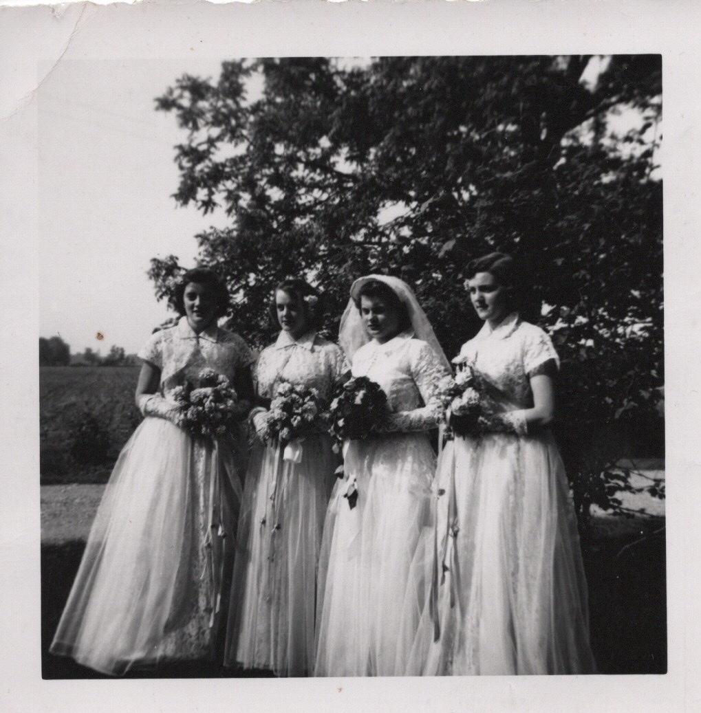 Ruth Sifton became Ruth Leitch in 1953 when she married John Leitch. The wedding photos were taken at her family farm. Ruth’s Bridesmaids wore blue, pink and yellow dresses while Ruth carried red roses. Ruth and John were the second people to be married in the United Church in Watford. “They had open steps outside. Now thats all covered in and the steps are inside” she remembers.