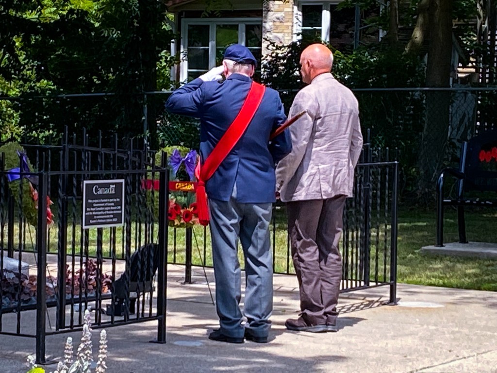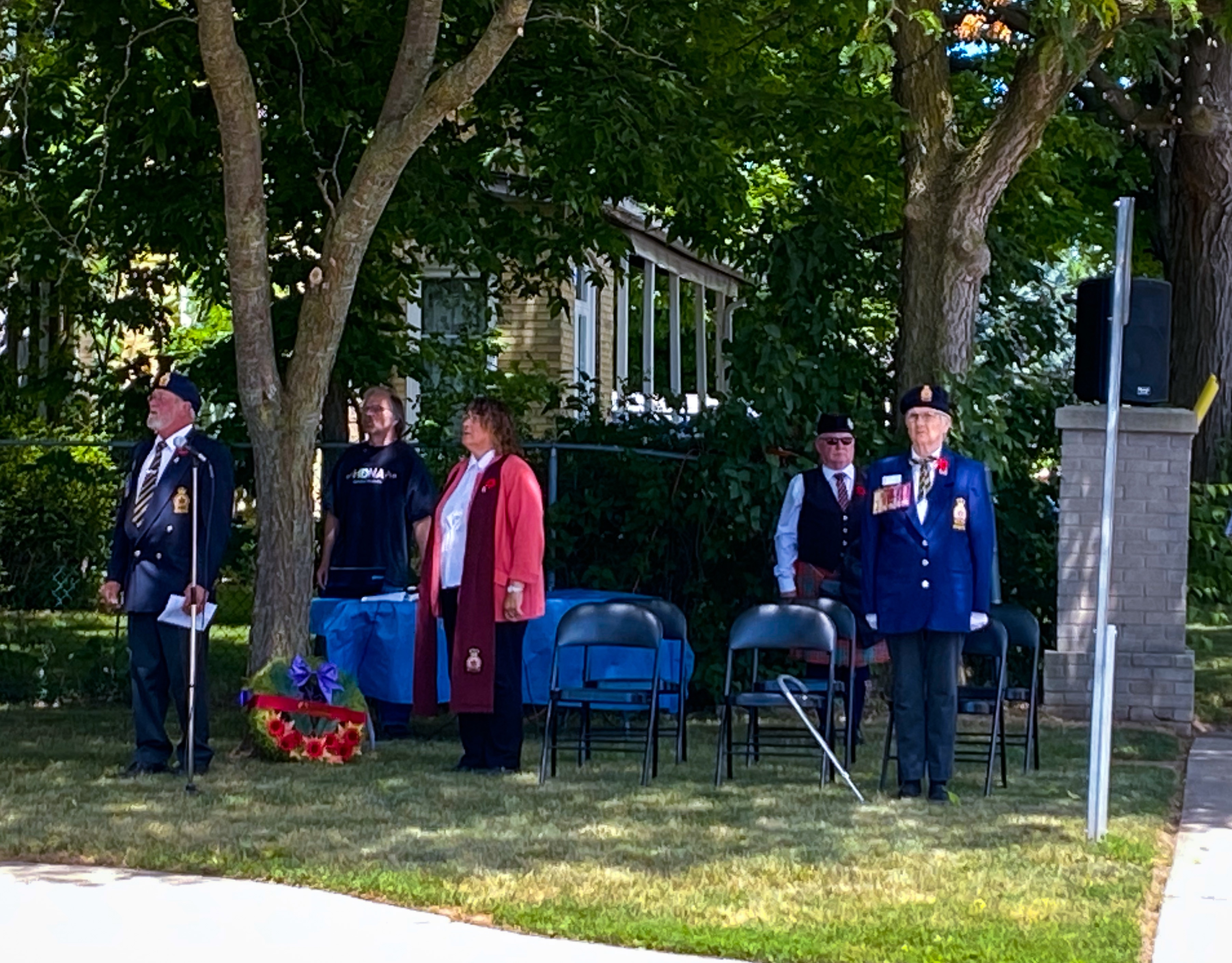 Legion members, Branch Executive, members of the Ladies Auxiliary met at Branch 249 at 1 pm and then marched to the cenotaph similar to the Remembrance Day march. President Jack MacDonald opened the ceremonies followed with a brief history of the cenotaph given by Legion Padre Jo-Anne Symington. Dignitaries then lain a few wreaths. All in attendance were then invited back to the legion for a light lunch provided by the Ladies Auxiliary.
