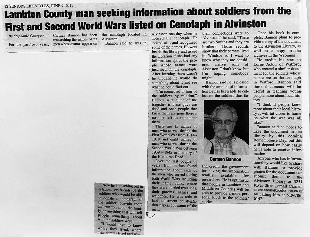In 2011 Carmen Bannon from Lambton County began researching the 23 men who’s names are inscribed on the cenotaph. After seeing the cenotaph and recognizing a few of the names he asked at the library quickly realizing there was no information to be found. “One of the tragedies is these guys are dead and once people that knew them are gone there’s no one left to remember them” he is quoted as saying in a newspaper article written by Stephanie Cattrysse. Bannon put together all the information he gathered on each name putting it into a book that you can now find at the Alvinston Library. He believed if people knew more about their local history the war we read about would hit closer to home.