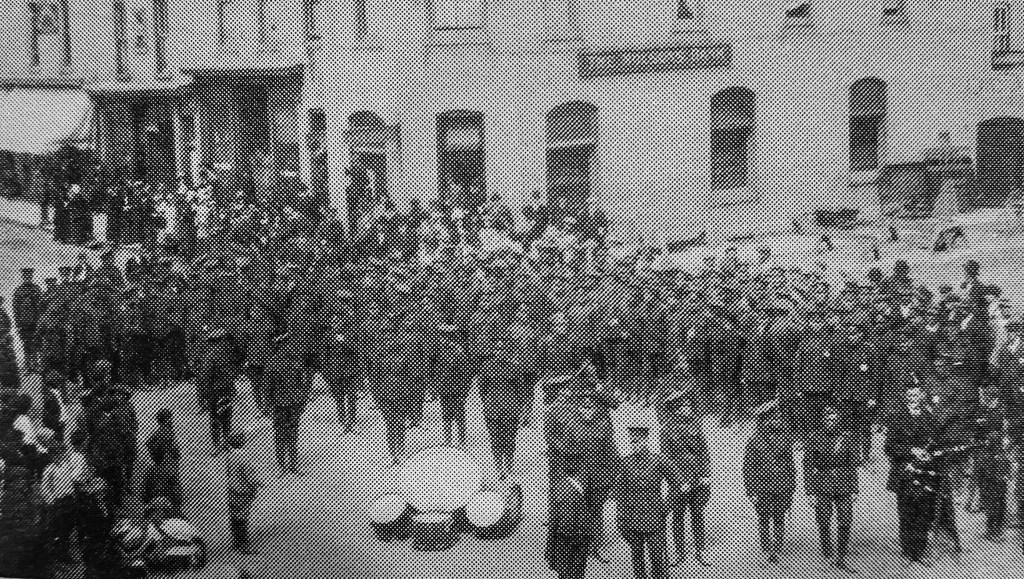 Armistice Day, November 11th 1918, Alvinston (Molson’s Bank in the background, Railroad and River Streets). Dugald Leitch piper front right.