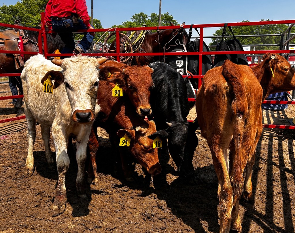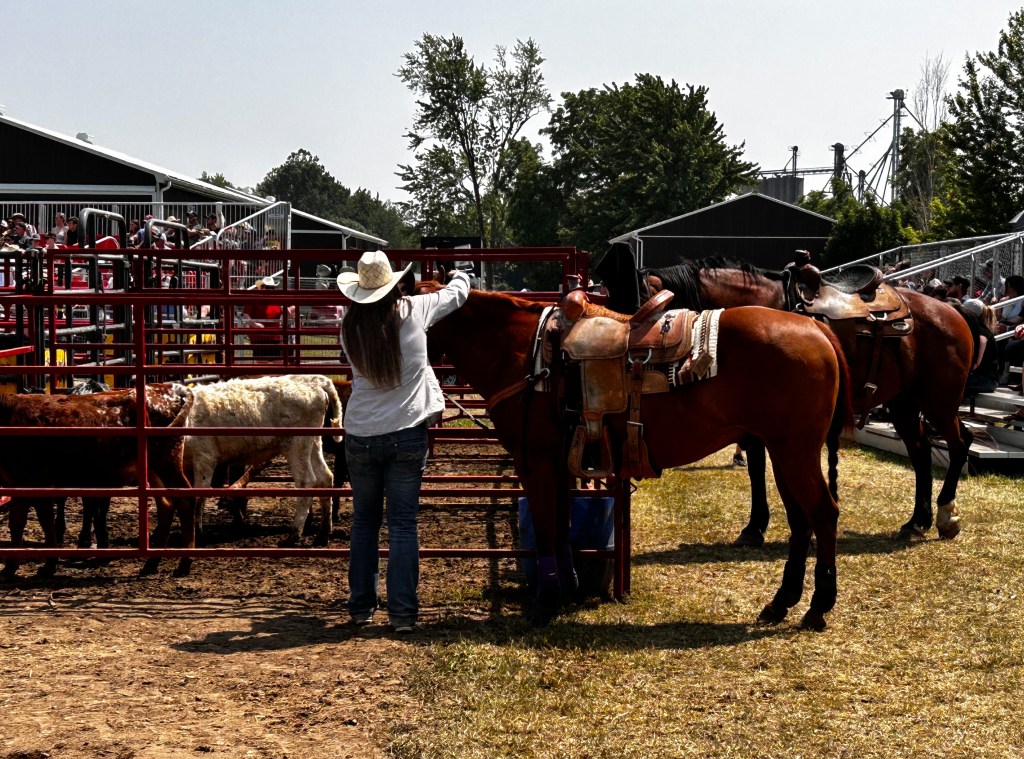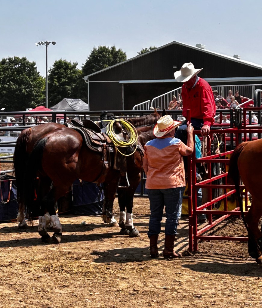 New this year Chuck Wagon Racing was added with Chuck Snowden who also runs chuck wagon races at Ontario Fairs. Dan Cumming is quoted as saying “We’ve seen the chuckwagon races happening at other big rodeos like the Calgary Stampede and thought, why not give this a try in Alvinston.” (Petrolia Lambton Independent Jun 16th 2023). Regular events included Bareback Bronc Riding, Saddle Bronc Riding, Steer Wrestling, Team Roping, Tie-Down Roping, Breakaway Roping, Barrel Racing plus Junior Barrel Racing, Junior Bull and Steer Riding and Bull Riding. Over 200 members of the International Professional Rodeo Association from around the world competed for top prizes in these events. Luckily the weather held out for another fantastic weekend!