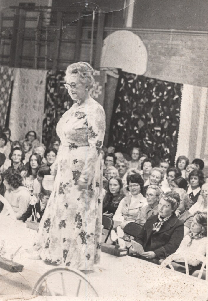 This photo was given to me by Marilyn Dolbear. It was taken at a fashion show in 1973. The model on the runway is Rheta McLean. Marylyn recognized Mavis Bryans in the audience, to the right of the model, dark hair and glasses. I would love more information for the photo, more names of folks in the audience, where the fashion show was held anything to add to the story of the photo.